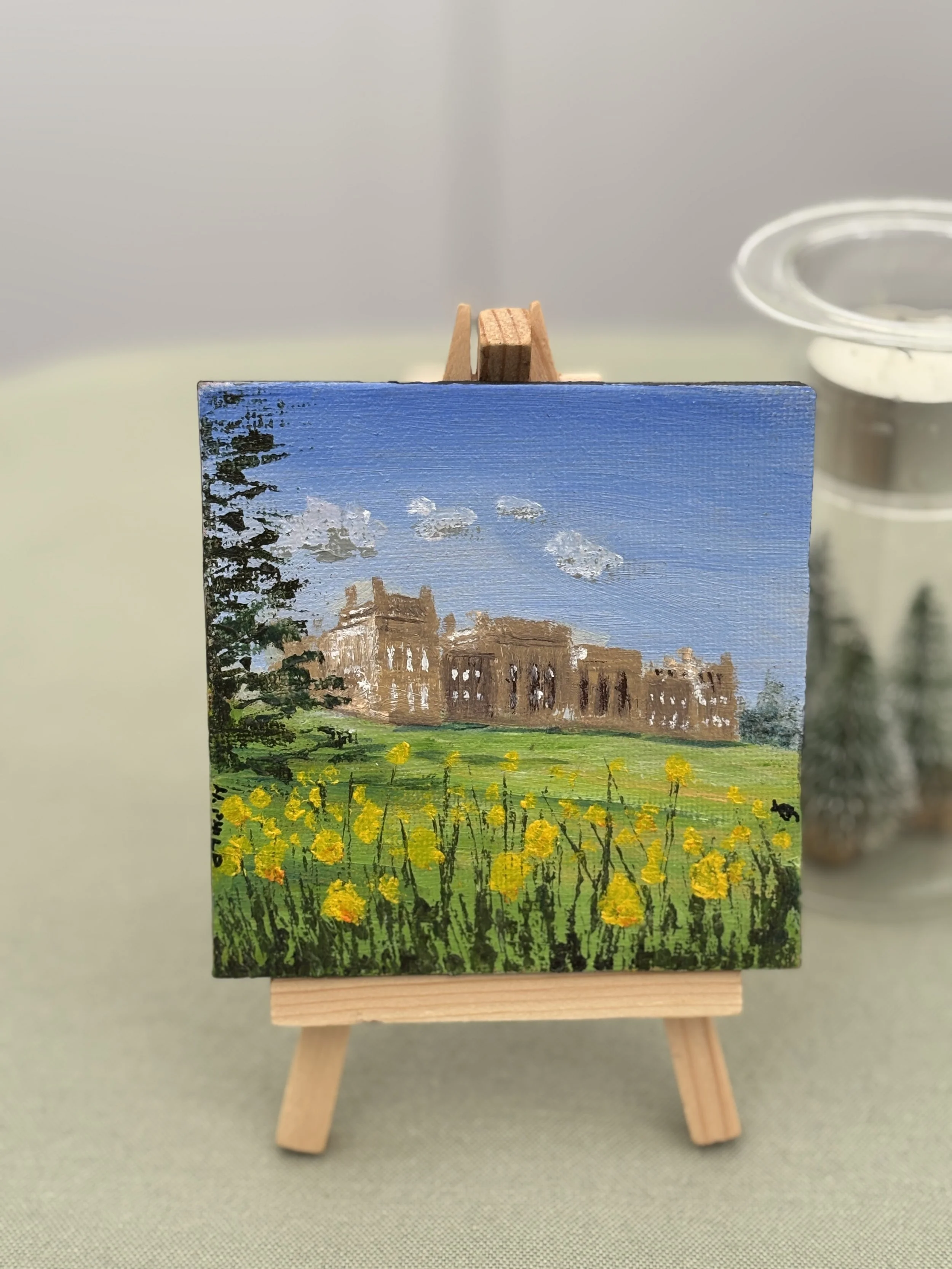 Miniature 10×10cm oil paintings, all one off and completely unique. A magnetic strip around the back allows for display on any metal surface, as well as on mini easels your shelf or they can be framed. Each painting is signed and “moused” on the back.