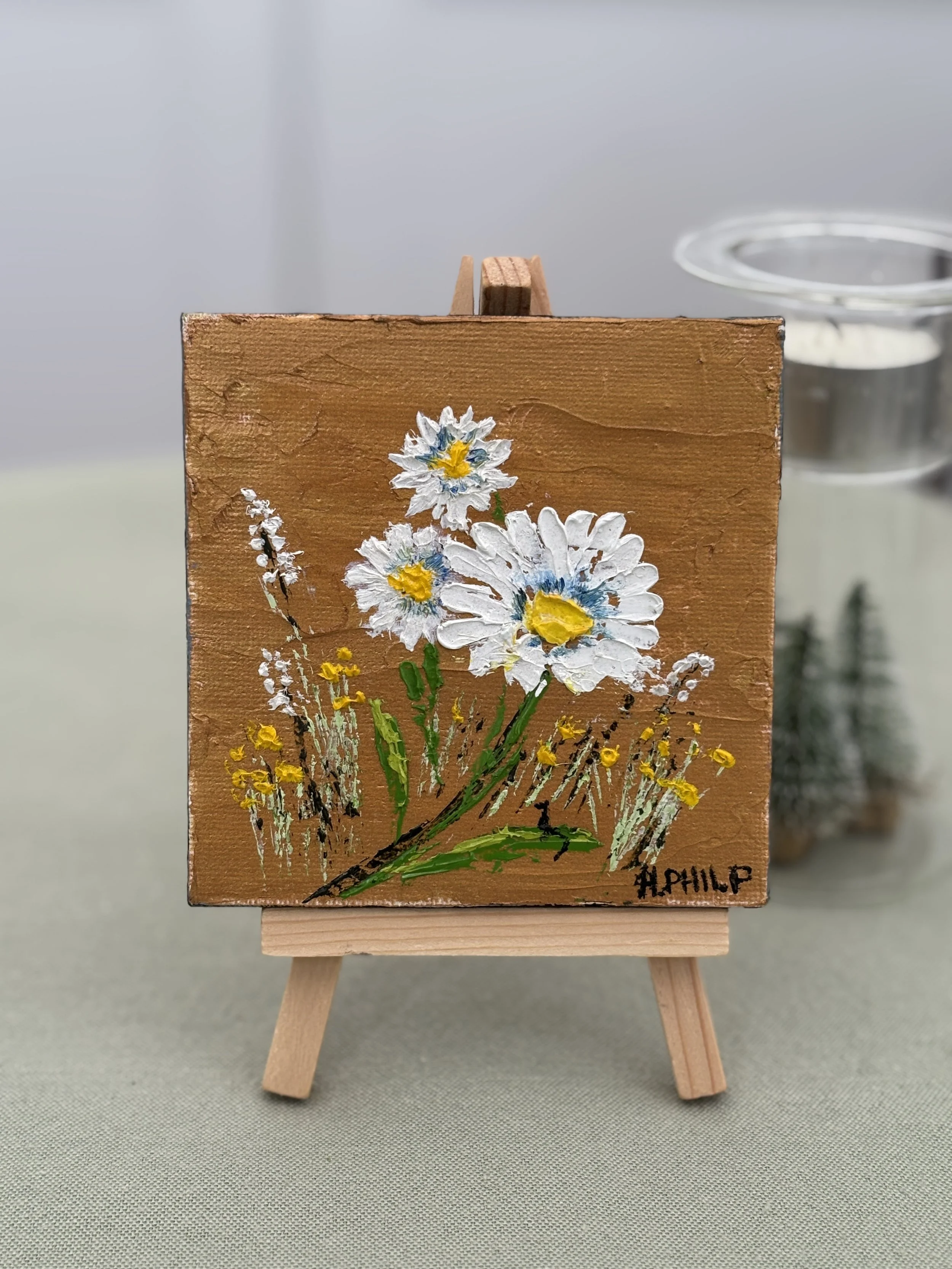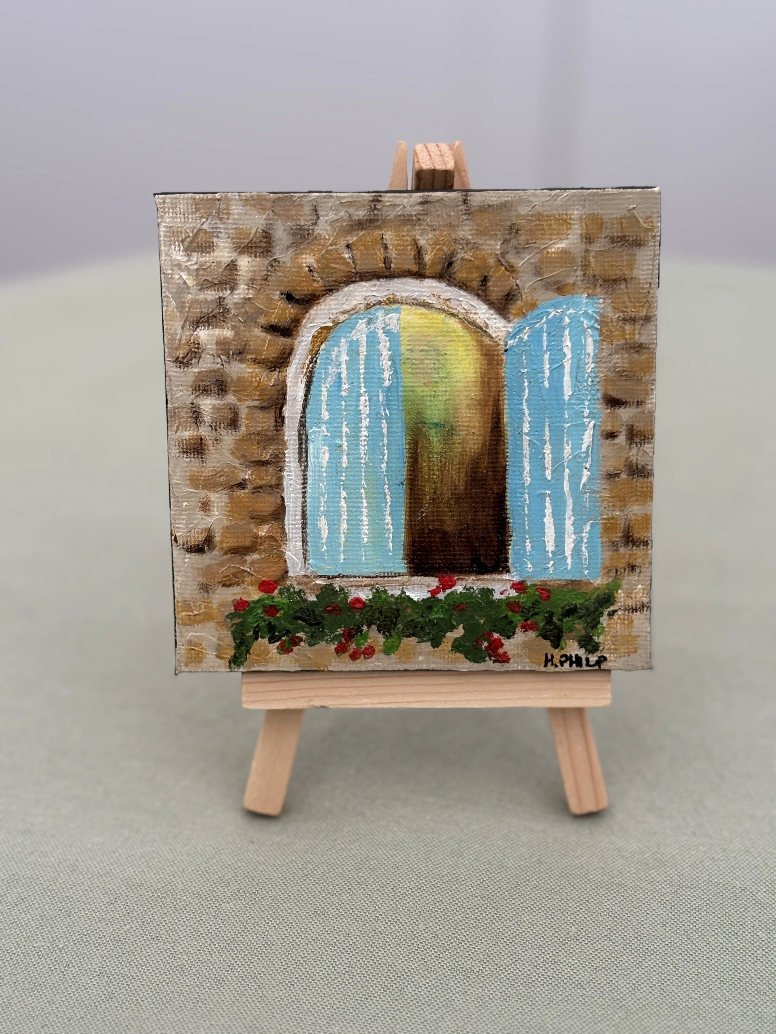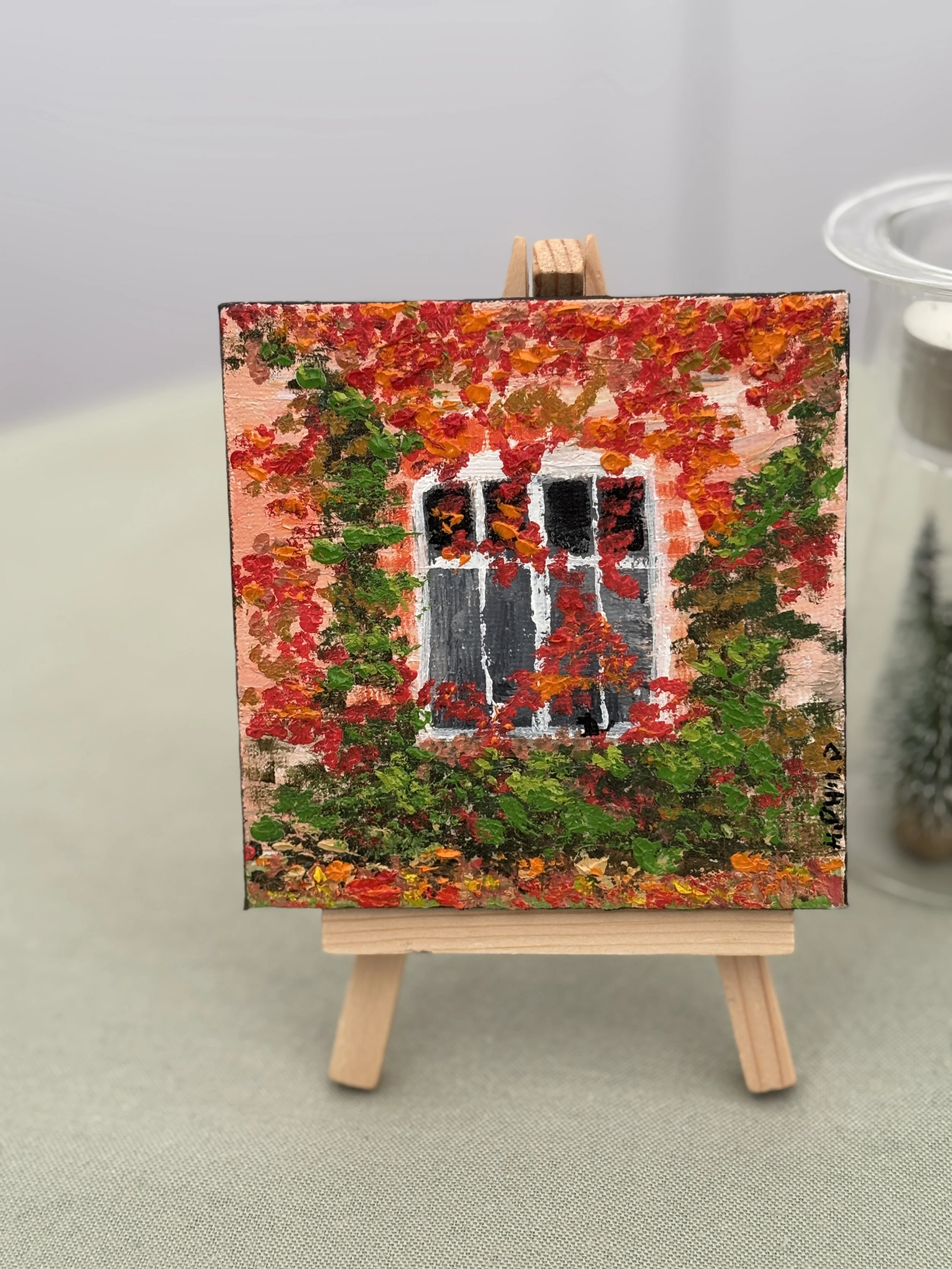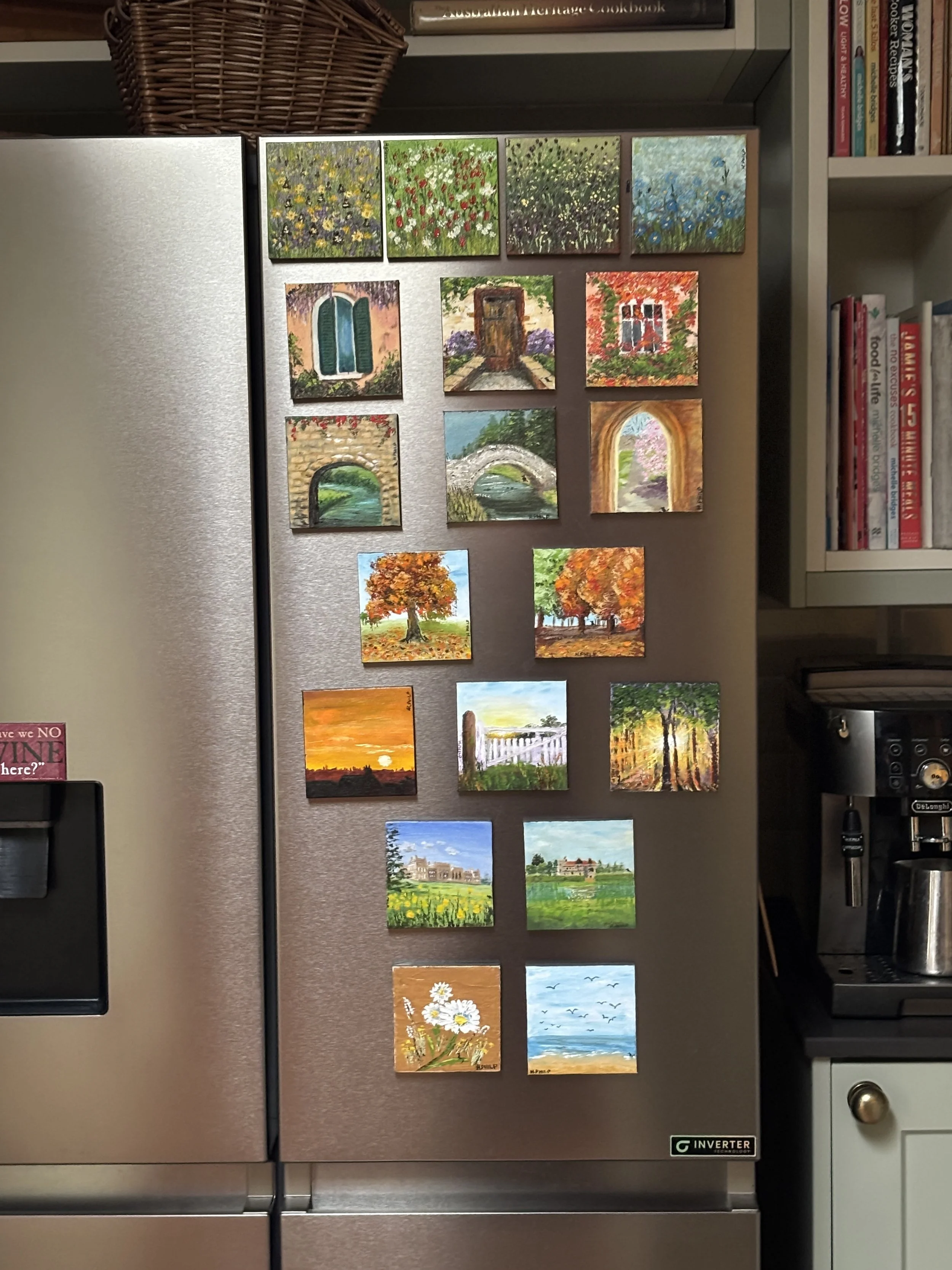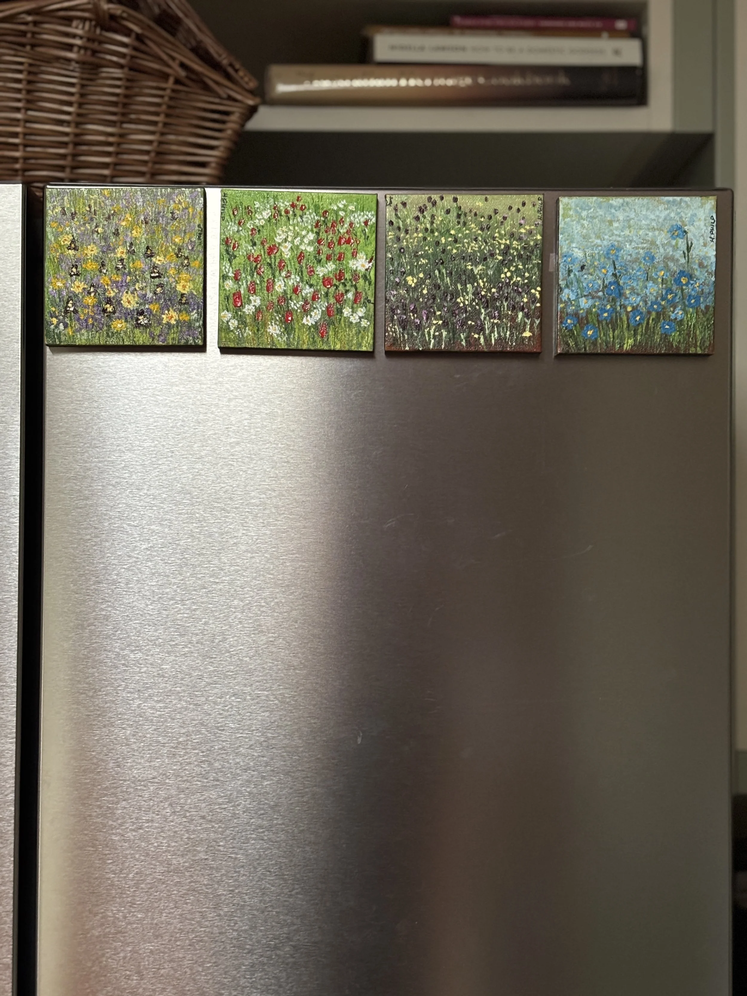 Miniature 10×10cm oil paintings, all one off and completely unique. A magnetic strip around the back allows for display on any metal surface, as well as on mini easels your shelf or they can be framed. Each painting is signed and “moused” on the back.